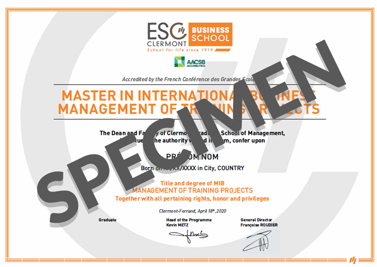 - le Master in International Business MiB - MANAGEMENT OF TRAINING PROJECTS awarded by ESC Clermont accredited AACSB.